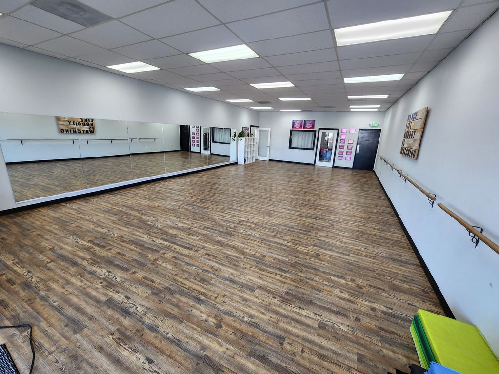 STUDIO ROOM 3 - Large dance room mainly used for tap and younger hip-hop classes. Like the other dance rooms, this has cubbies for dancers to put their belongings in. The dressing room is also located in this room. Between the bathrooms and dressing room, the dancers have multiple places to change.